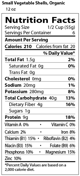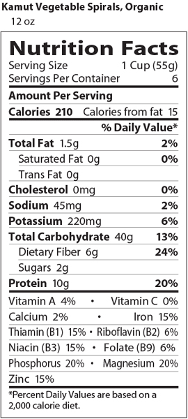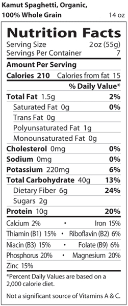 Total Fat 3.5g (5% DV) Saturated Fat 0g (0% DV) Trans Fatty Acid (<0.01% DV) Cholestrol 0mg (0% DV) Sodium 10mg (0% DV) Total Carbohydrate 3g (1% DV) Dietary Fiber 2g (7% DV) Sugar 1g Protein 7g Vitamin A (0% DV) Vitamin C (0% DV) Calcium (4% DV) Iron (35% DV)